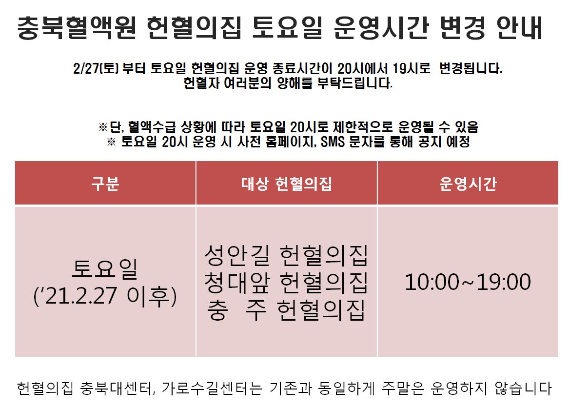 2021년 2월 27일(토)부터 충북혈액원 관할 일부 헌혈의집 토요일 운영시간이 아래와 같이 변경됩니다.