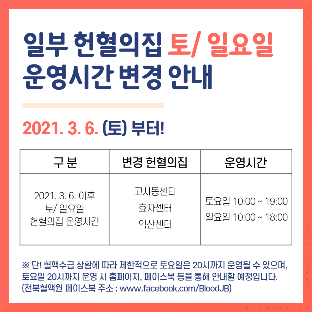 일부 헌혈의집 주말 운영시간이 변경되어 안내드립니다.