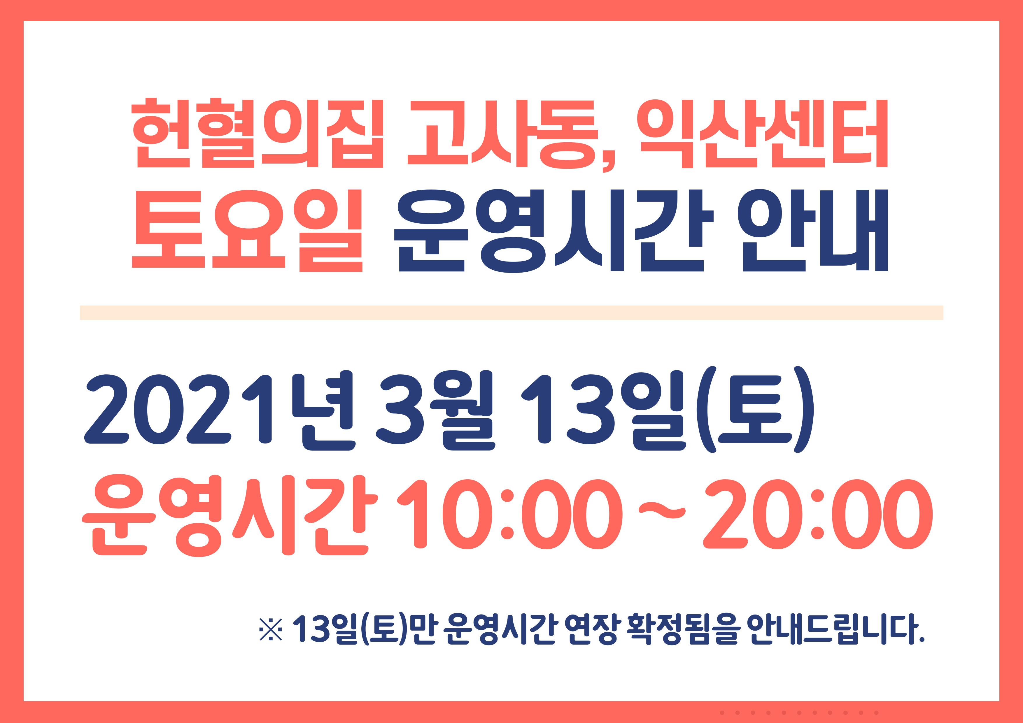 3월 13일(토) 전북혈액원 헌혈의집 고사동, 익산센터 연장운영 안내