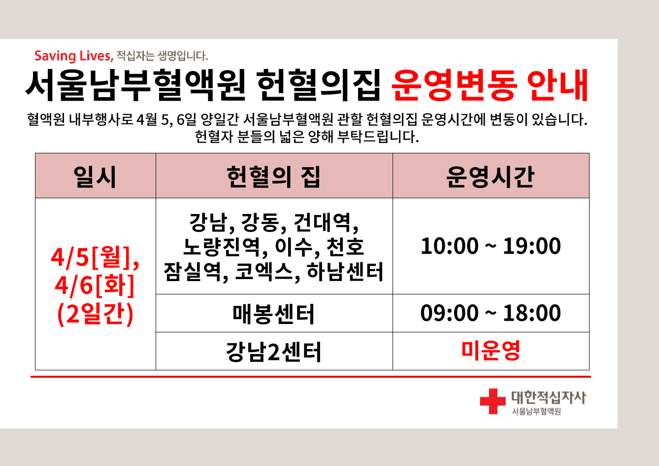 4월 5, 6일 서울남부혈액원 관할 헌혈의집 운영시간 변동안내