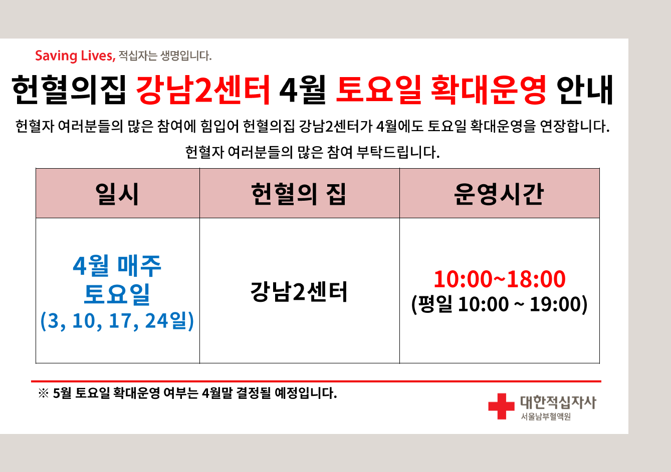 헌혈의집 강남2센터 4월 토요일 확대운영 실시안내