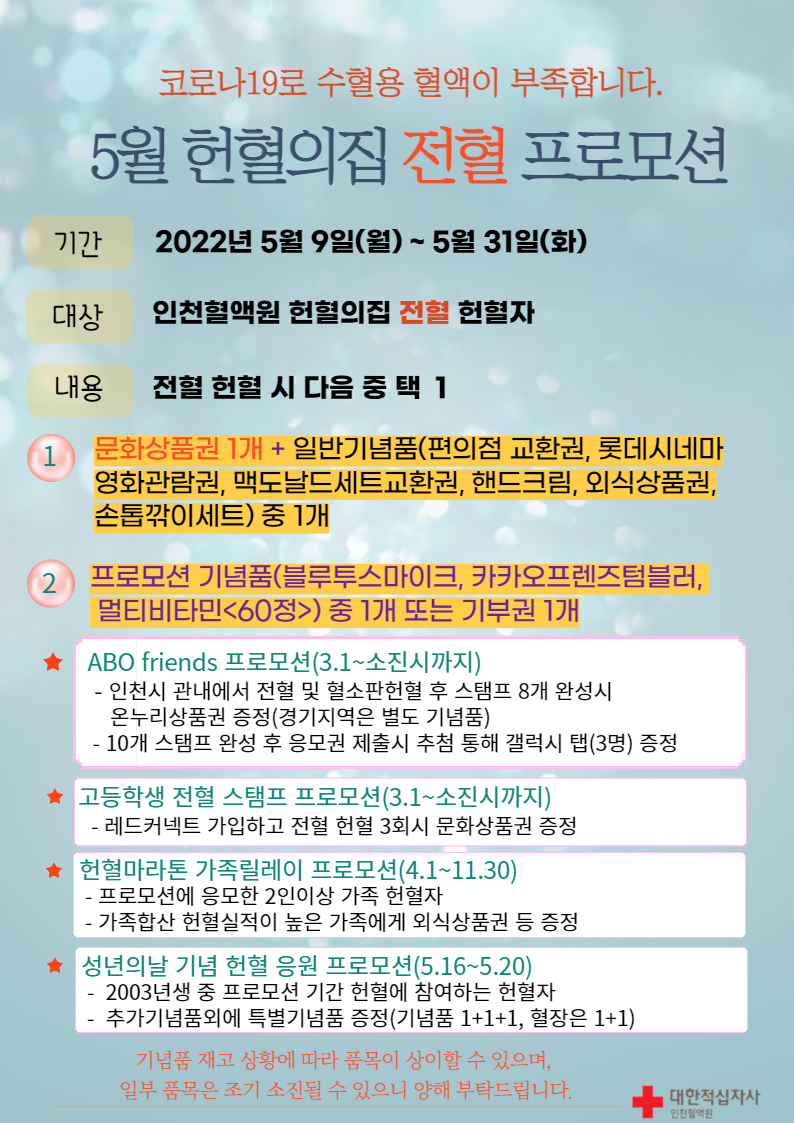 인천혈액원 5월 전혈프로모션을 다음과 같이 안내드리고자 합니다.