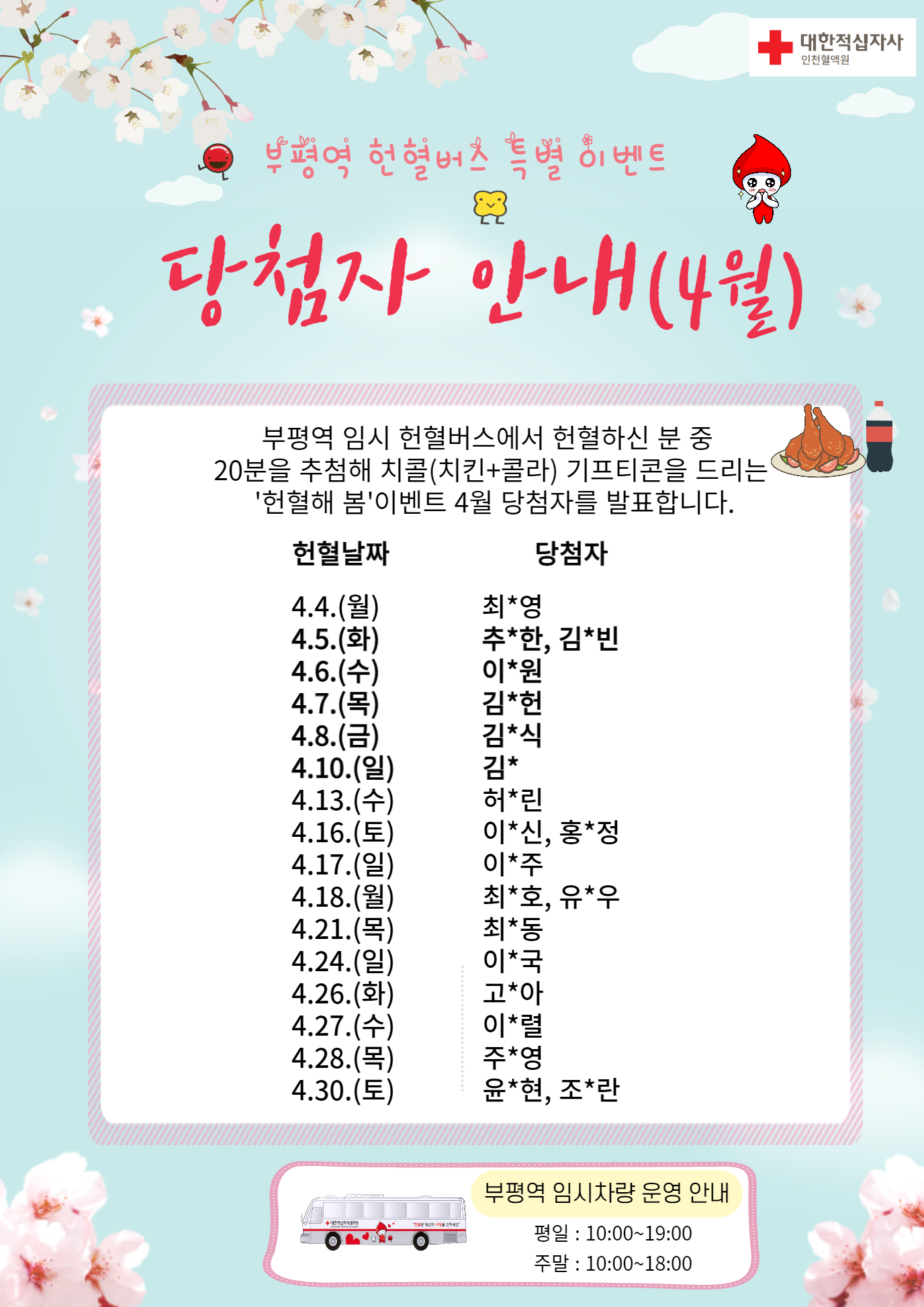 인천혈액원 부평역 임시 헌혈버스 특별이벤트 당첨자 안내(4월)