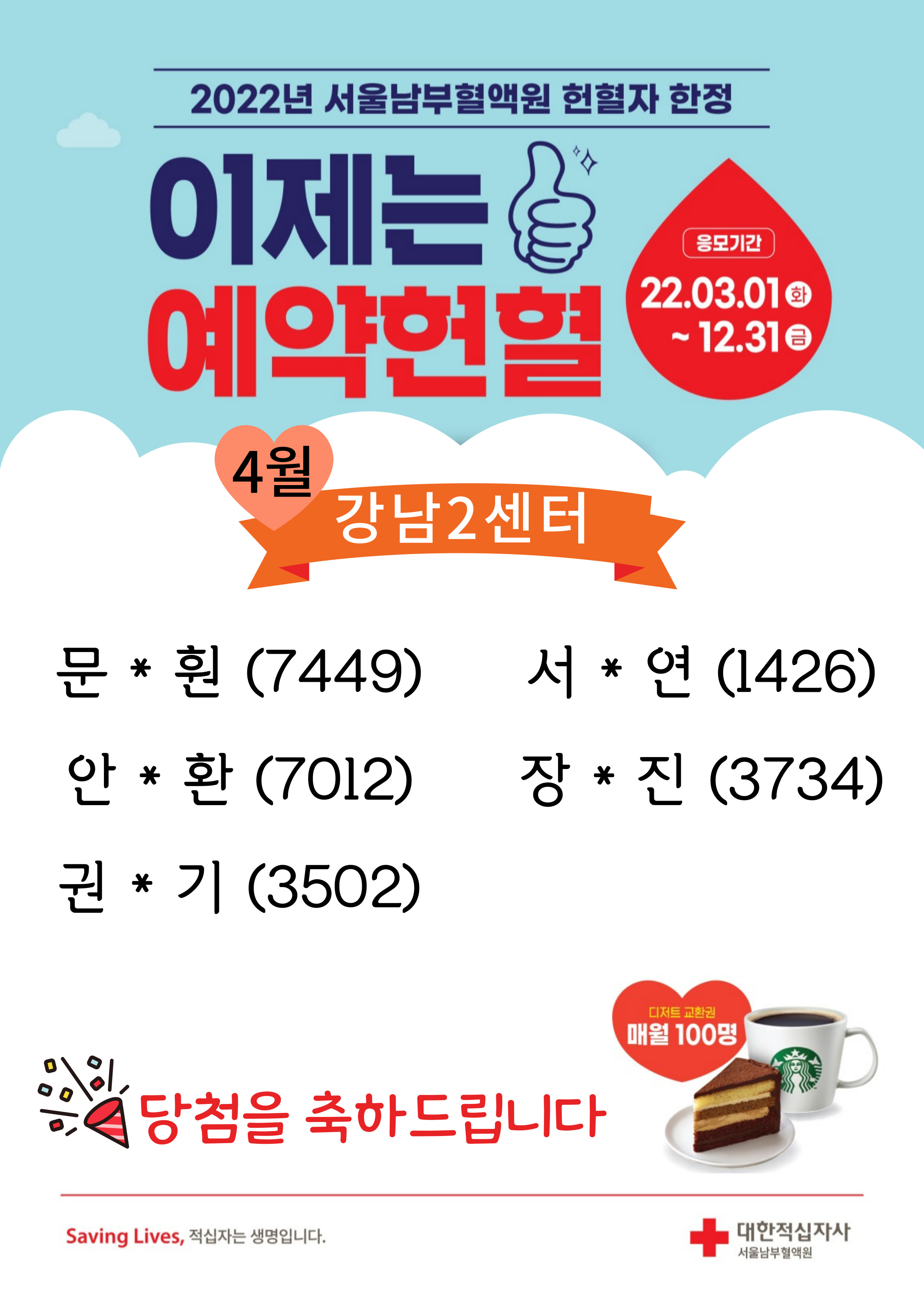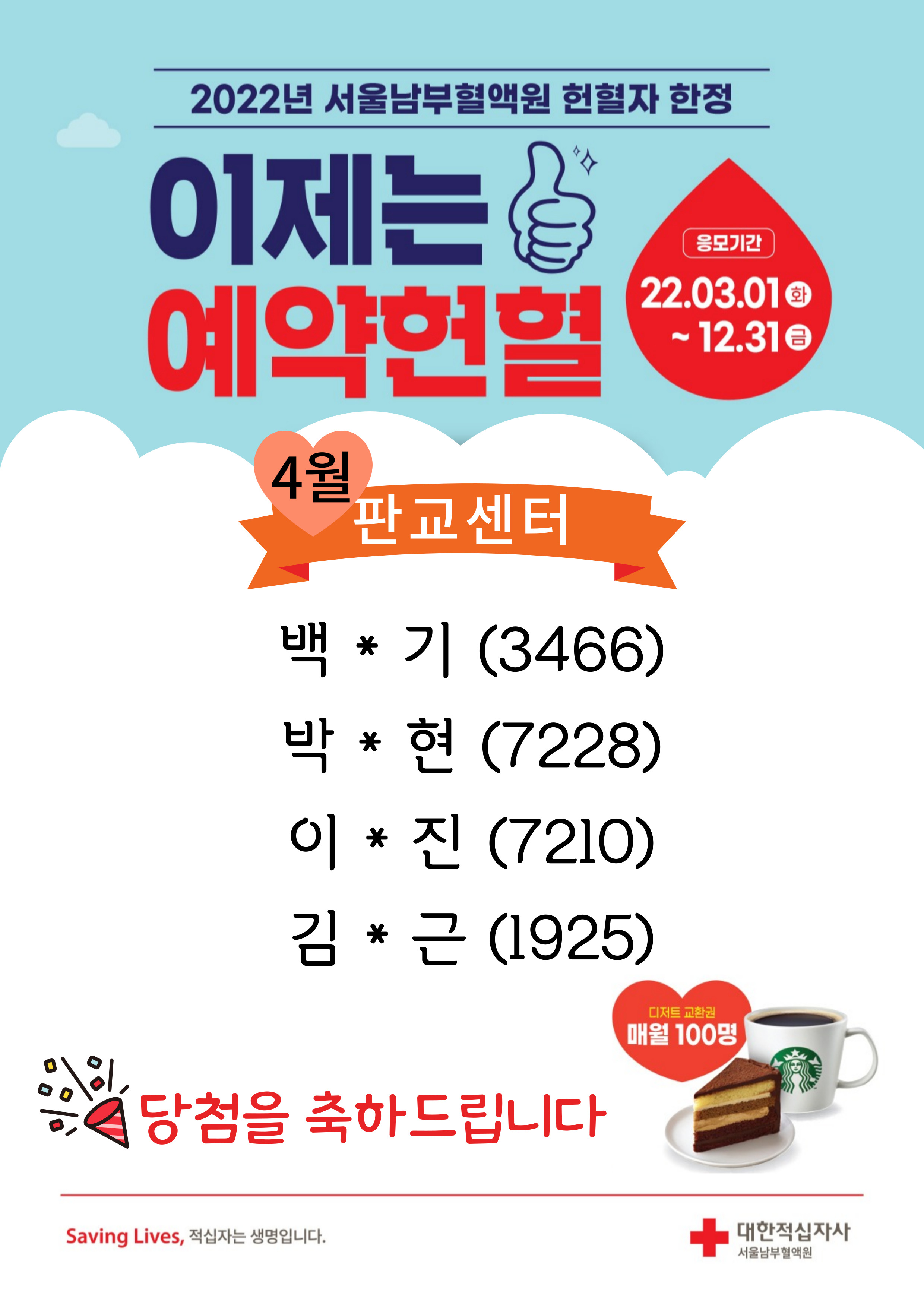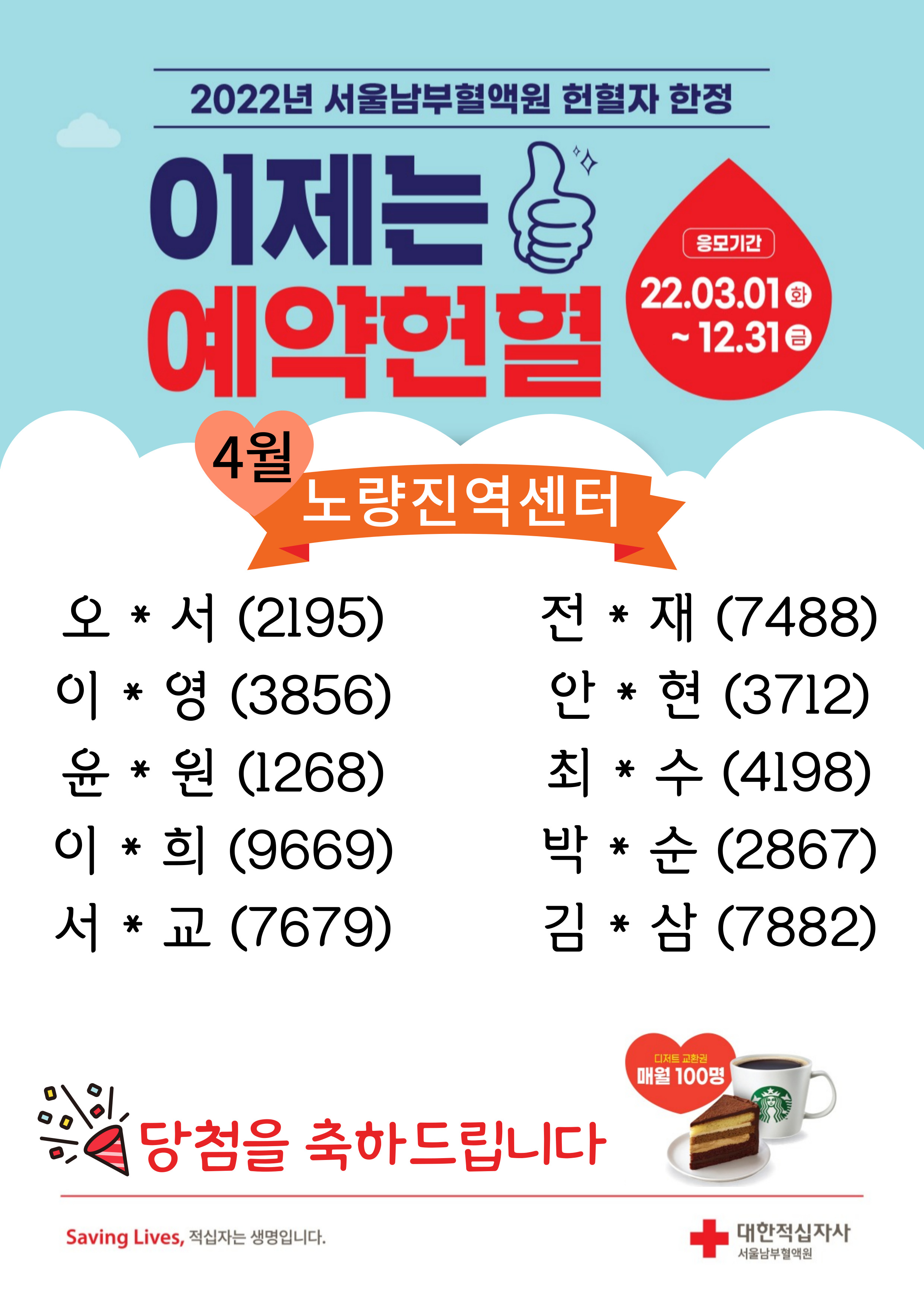[서울남부] 4월 예약헌혈 당첨자 발표