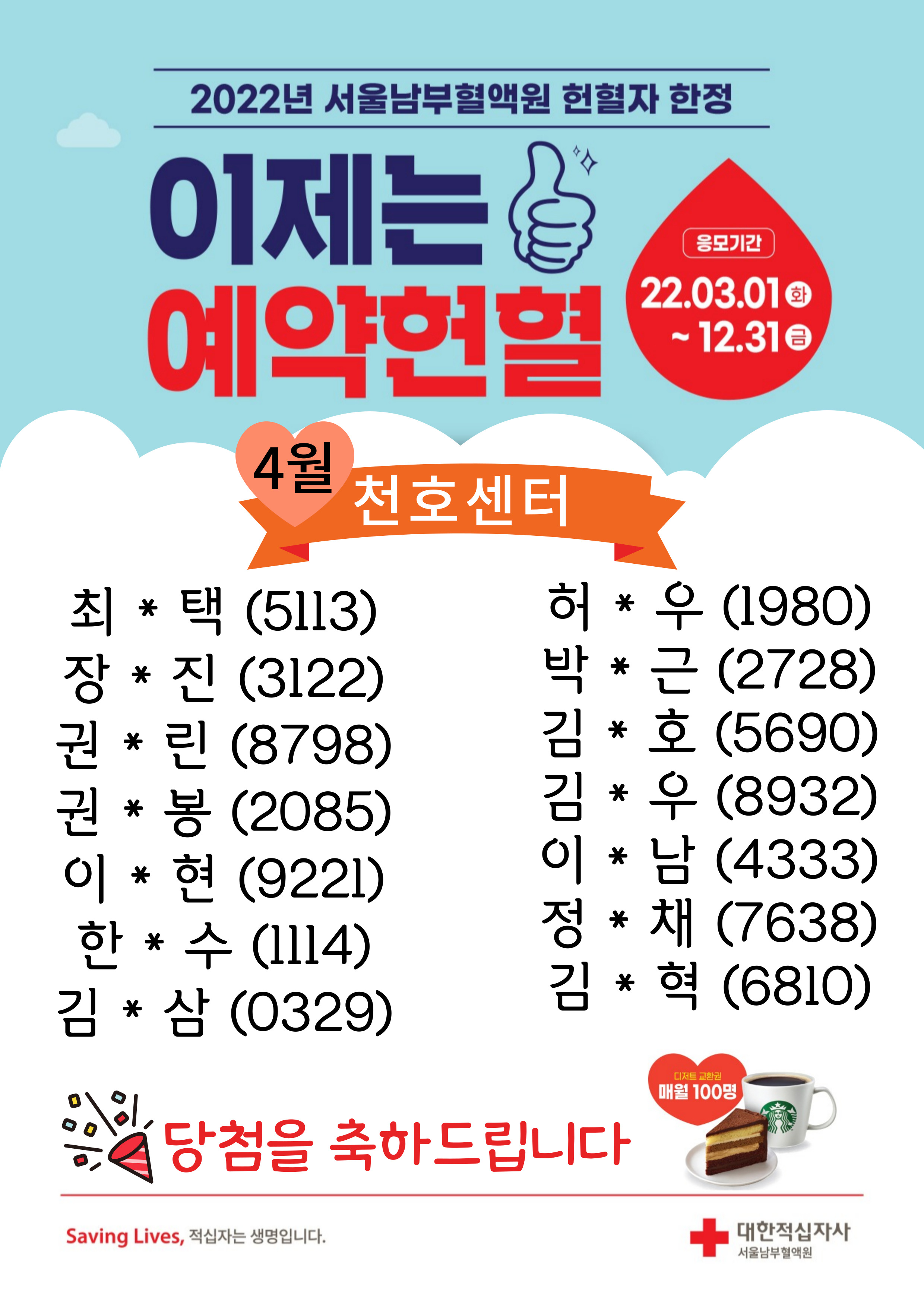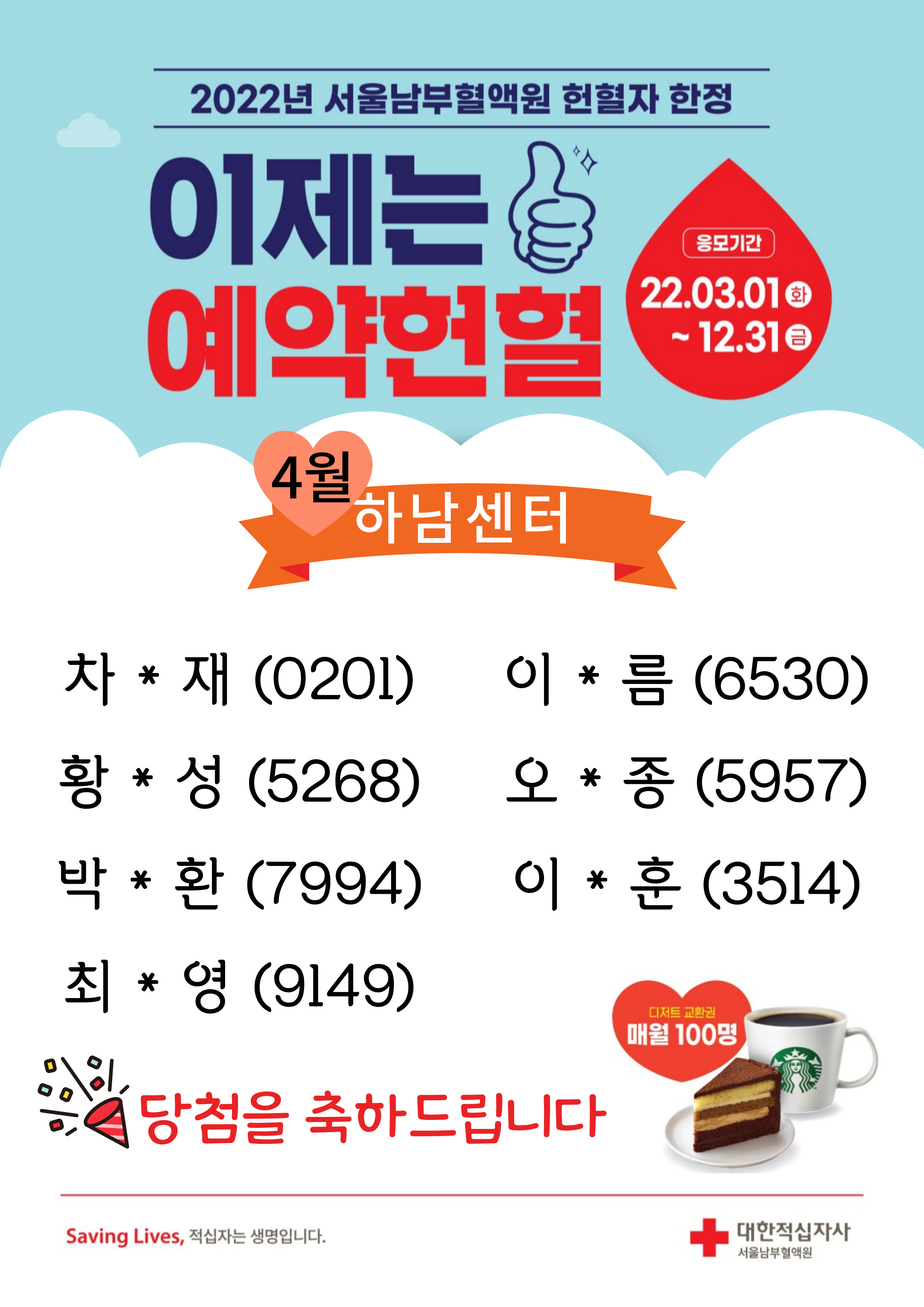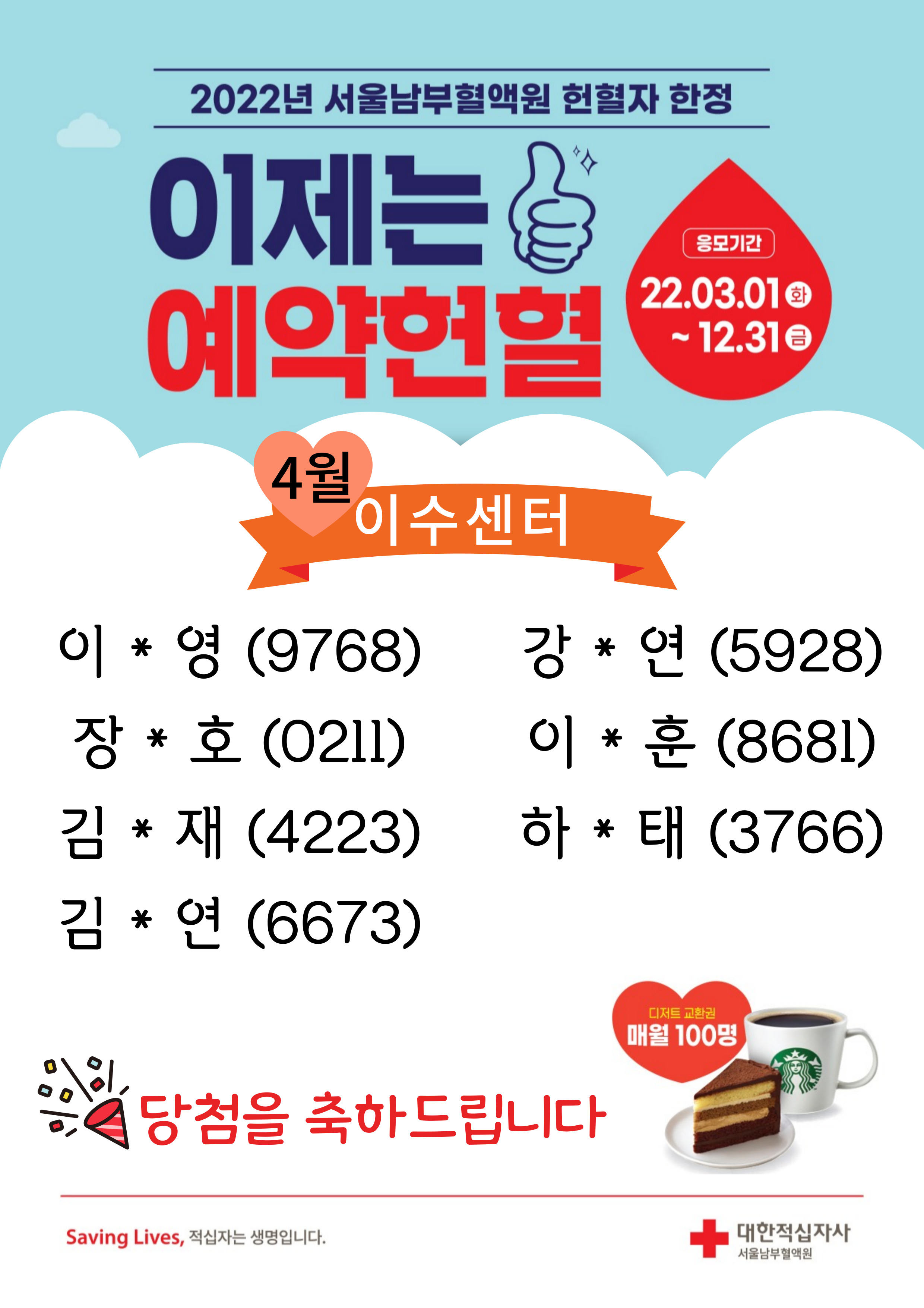 [서울남부] 4월 예약헌혈 당첨자 발표
