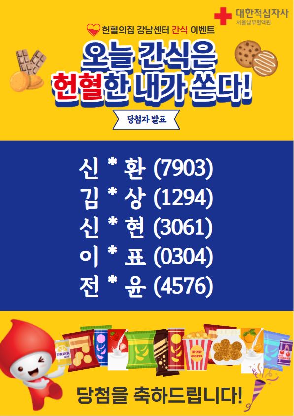 4월 강남센터에서 헌혈 후 응모해주신 분들 대상으로 진행된 "오늘 간식은 헌혈한 내가 쏜다!" 이벤트 당첨자를 다음과 같이 발표드립니다.