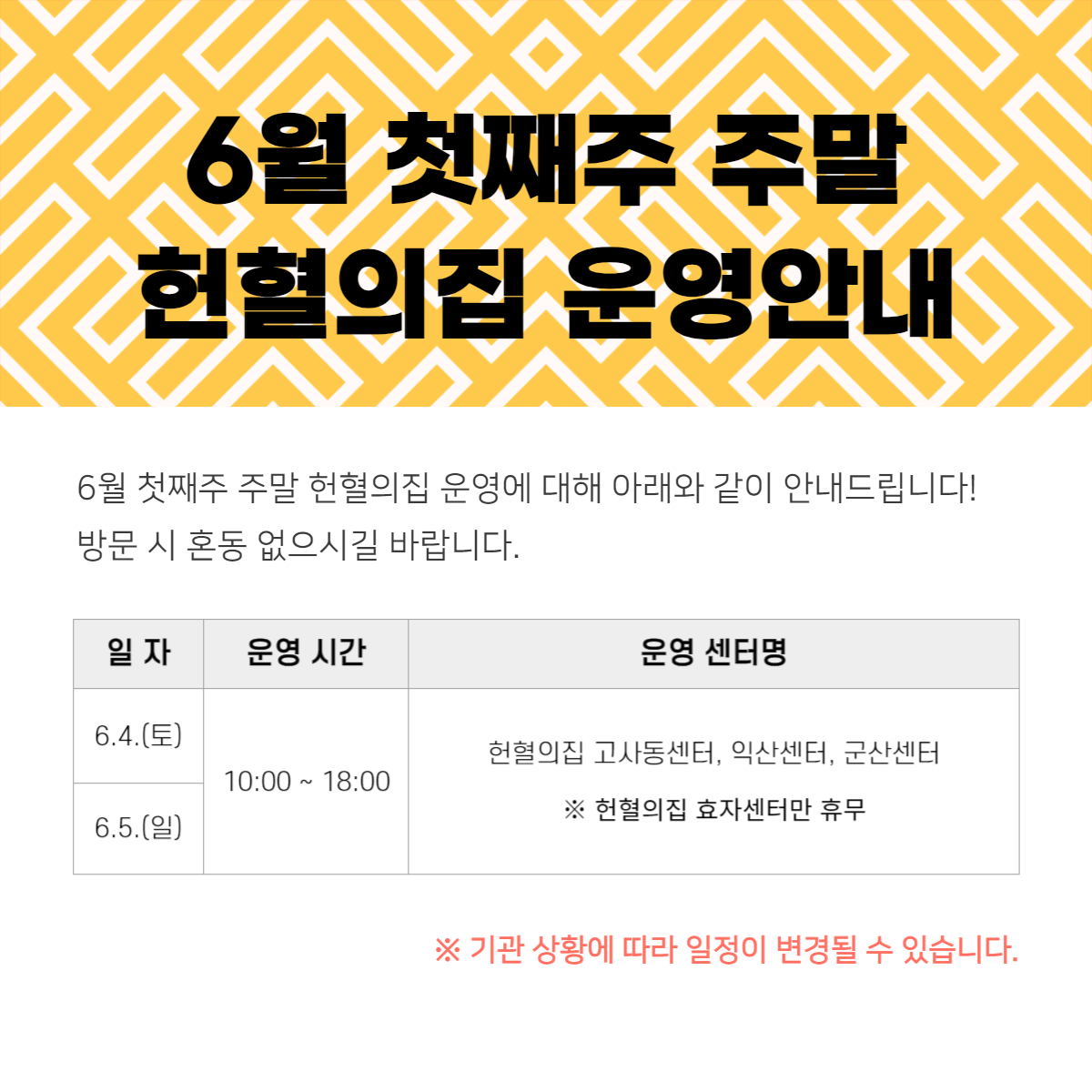 6월 첫째주 주말(4~5일) 헌혈의집 운영안내드립니다. (효자센터만 미운영)
