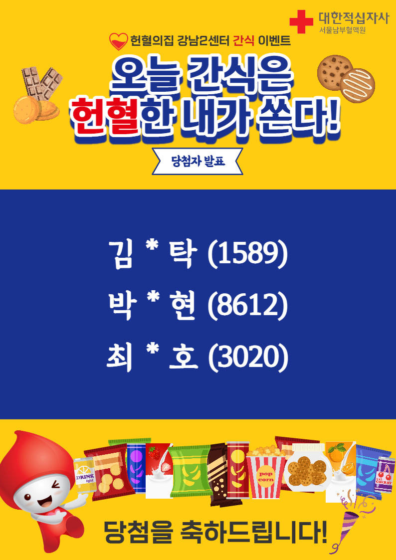 5월 강남2센터에서 헌혈 후 응모해주신 분들 대상으로 진행된 "오늘 간식은 헌혈한 내가 쏜다!" 이벤트 당첨자를 다음과 같이 발표드립니다.