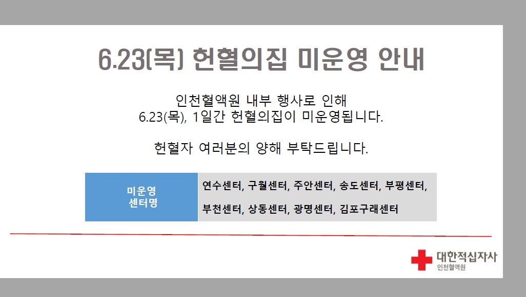 인천혈액원 6월 23일(목) 헌혈의집 미운영 안내