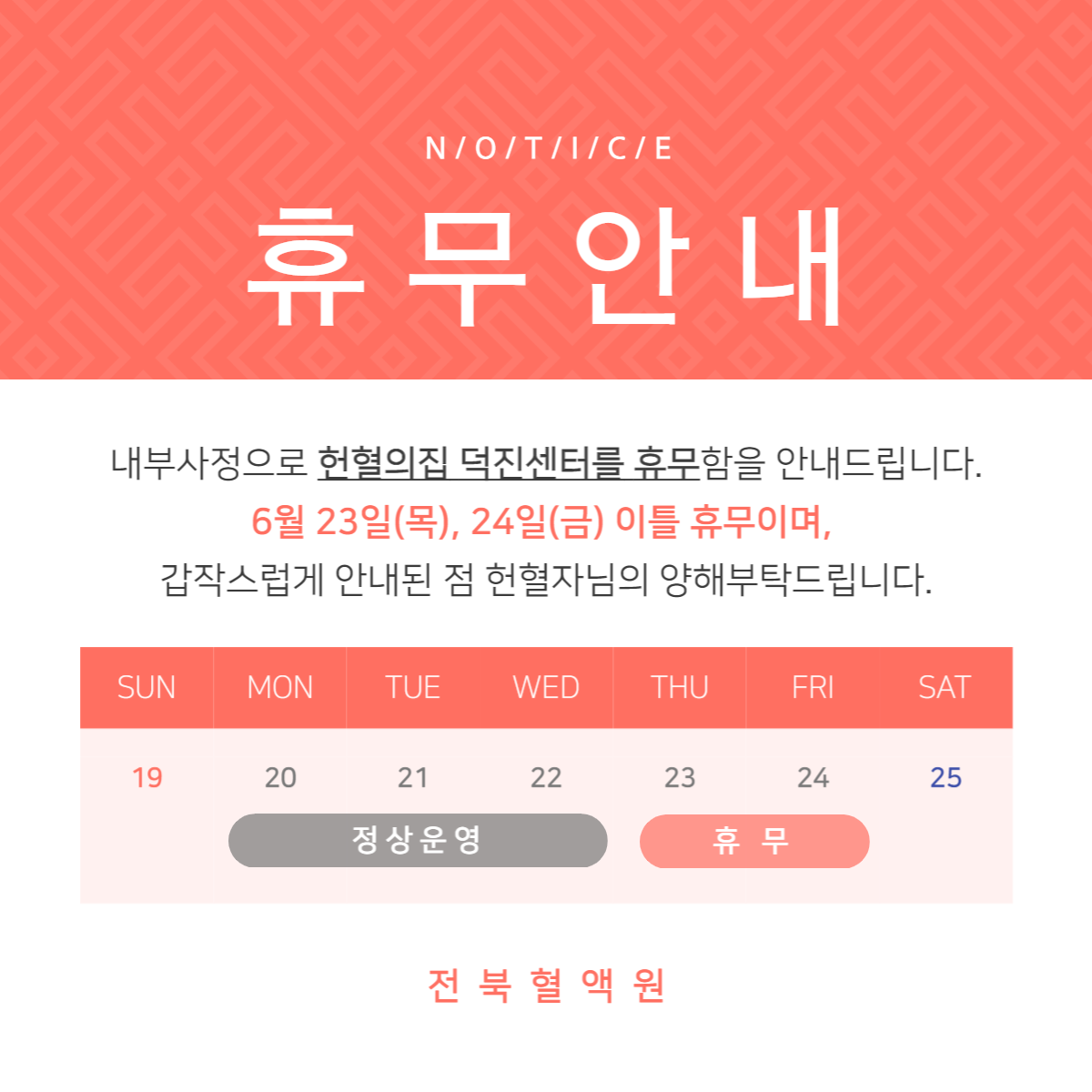 내부사정으로 헌혈의집 덕진센터를 이틀간 휴무하게 되어 안내드립니다.