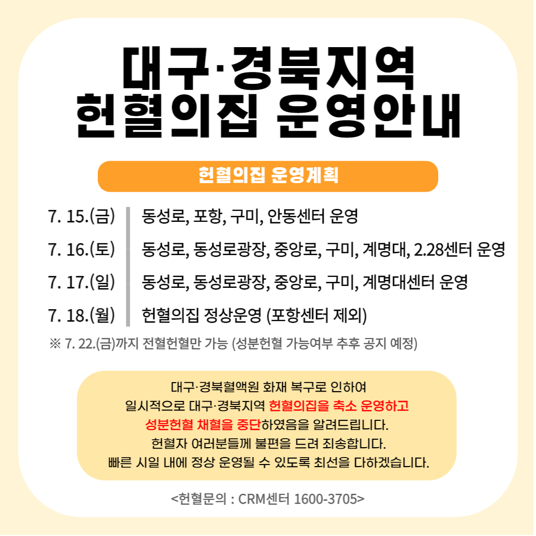 대구·경북혈액원 헌혈의집 운영계획 안내(7월12일~15일, 22일까지 전혈만 가능)