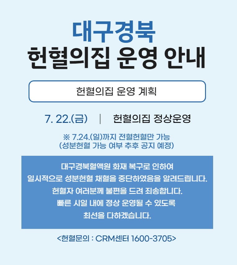대구·경북혈액원 헌혈의집 운영계획 안내