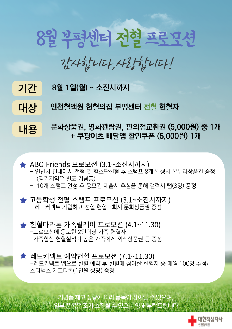 인천혈액원 8월 헌혈의집 부평센터 전혈 프로모션을 다음과 같이 안내드리고자 합니다.