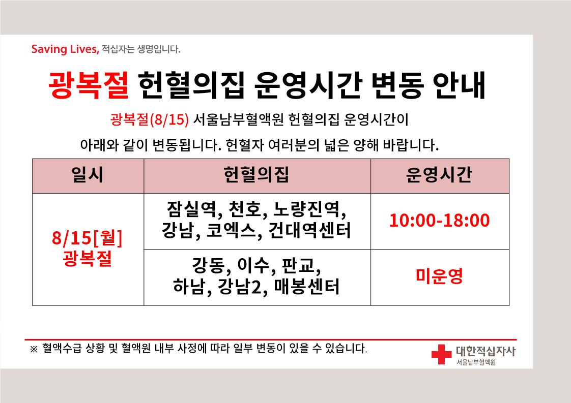 광복절(8/15) 서울남부혈액원 헌혈의집 운영시이 아래와 같이 변동 됩니다.