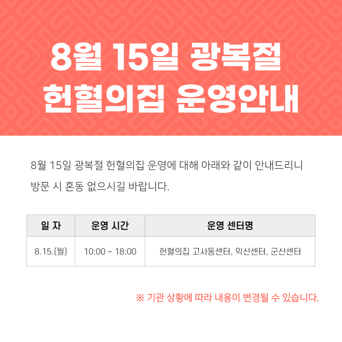 8.15 광복절 전북 헌혈의집 운영 안내