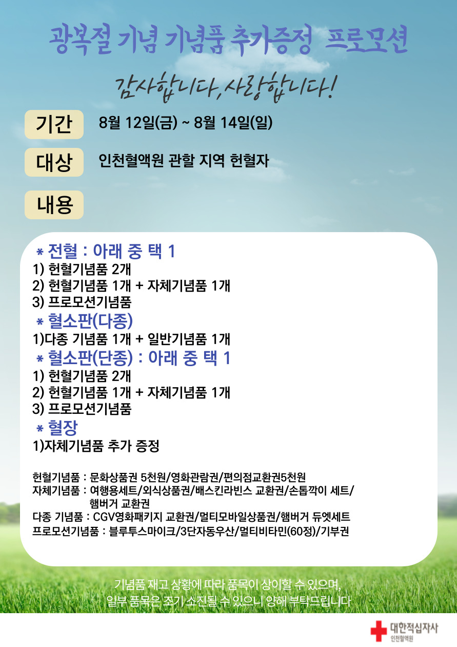 인천혈액원 광복절 연휴 기념품 추가증정 프로모션을 다음과 같이 안내드리고자 합니다.