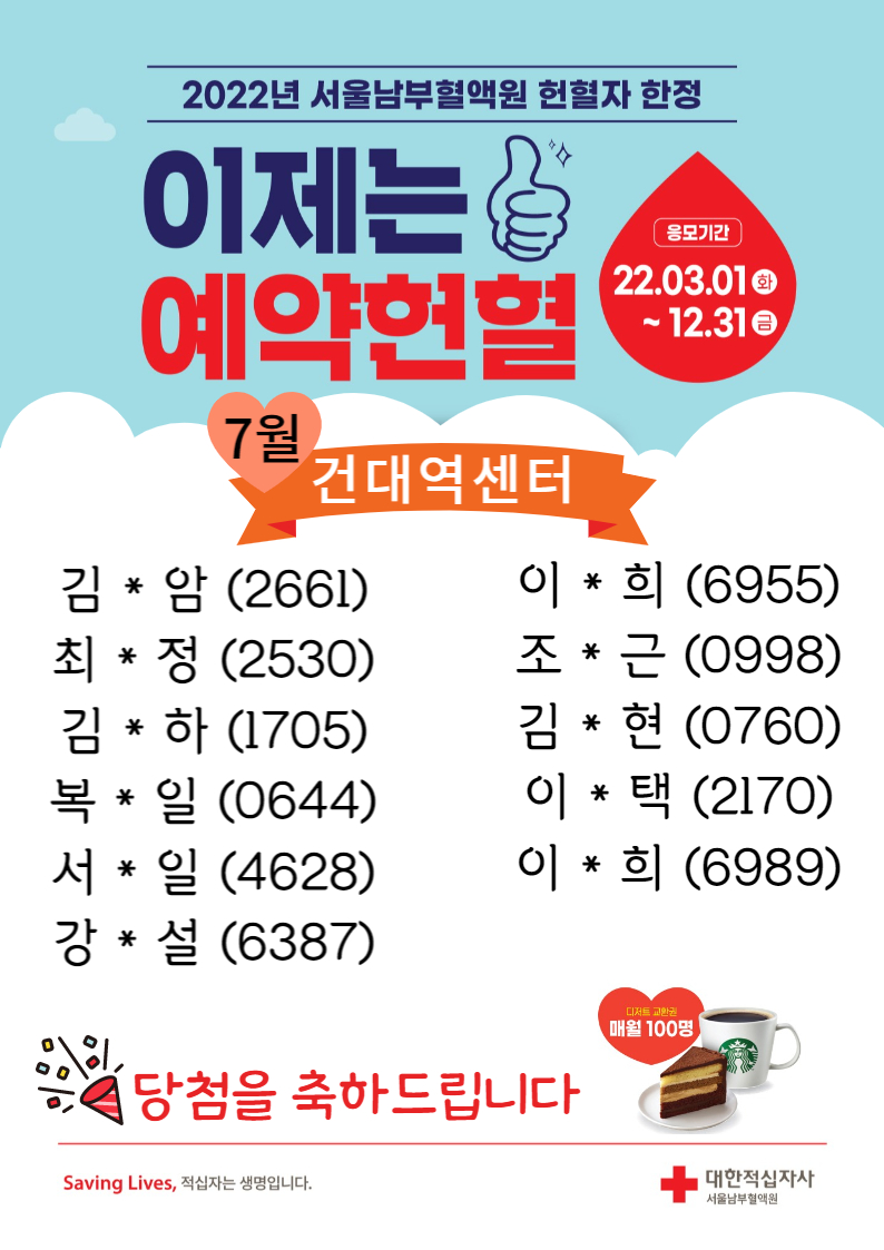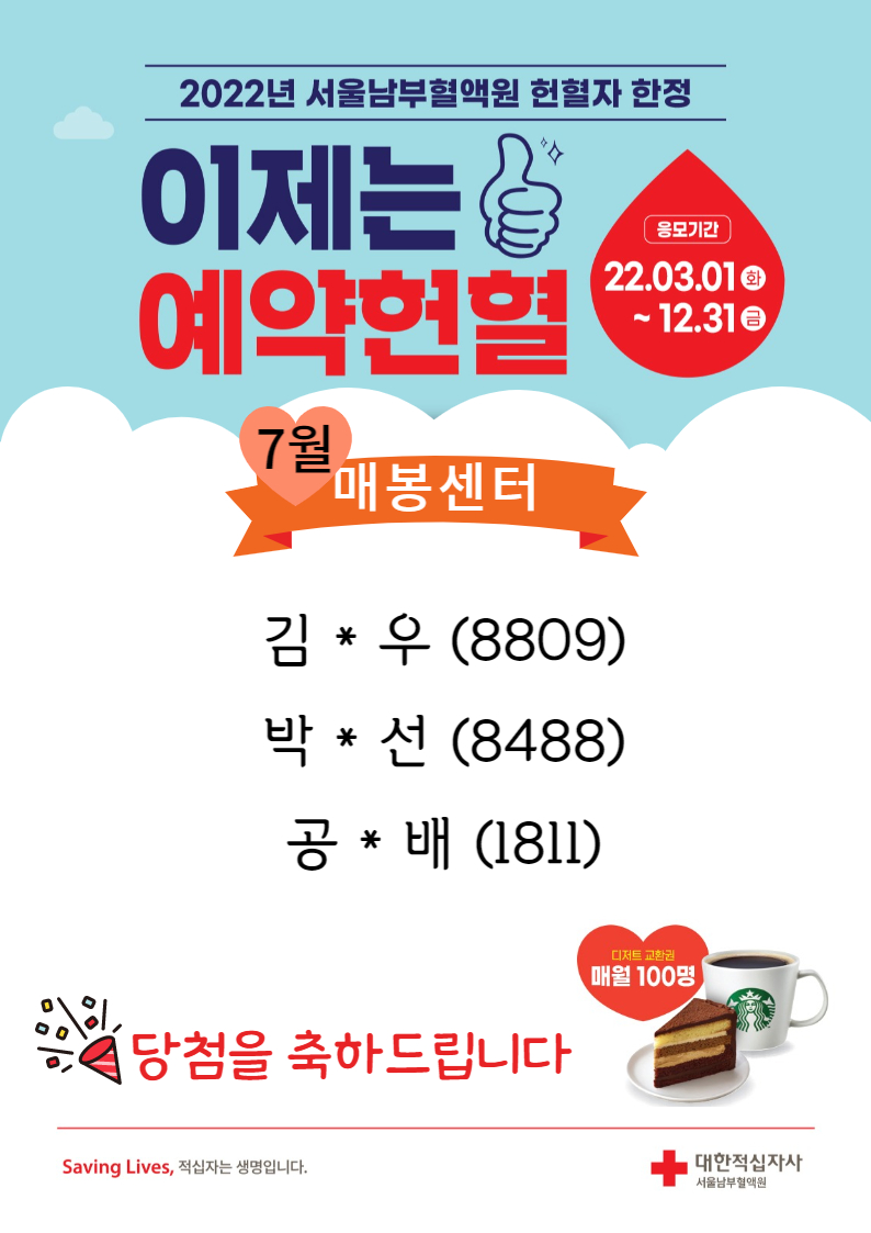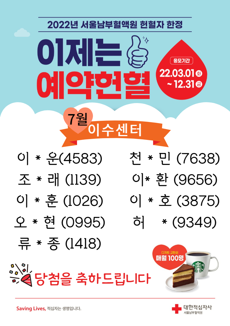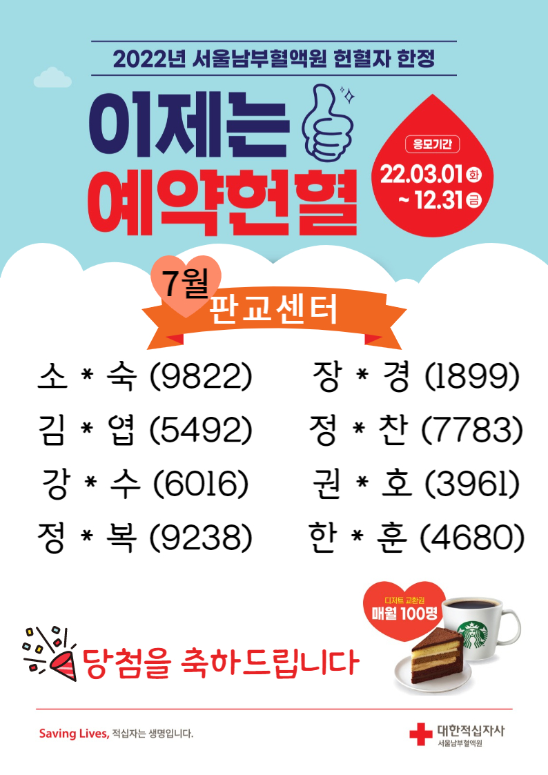 [서울남부] 7월 예약헌혈 이벤트 당첨자 발표