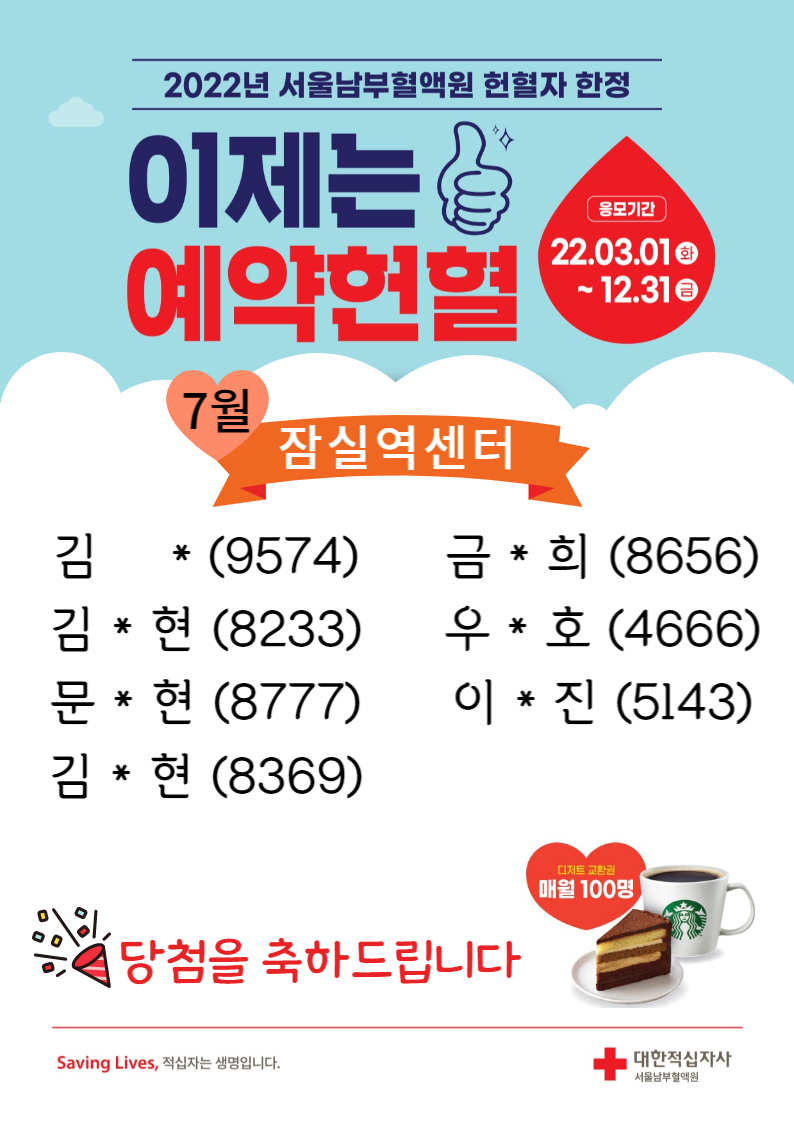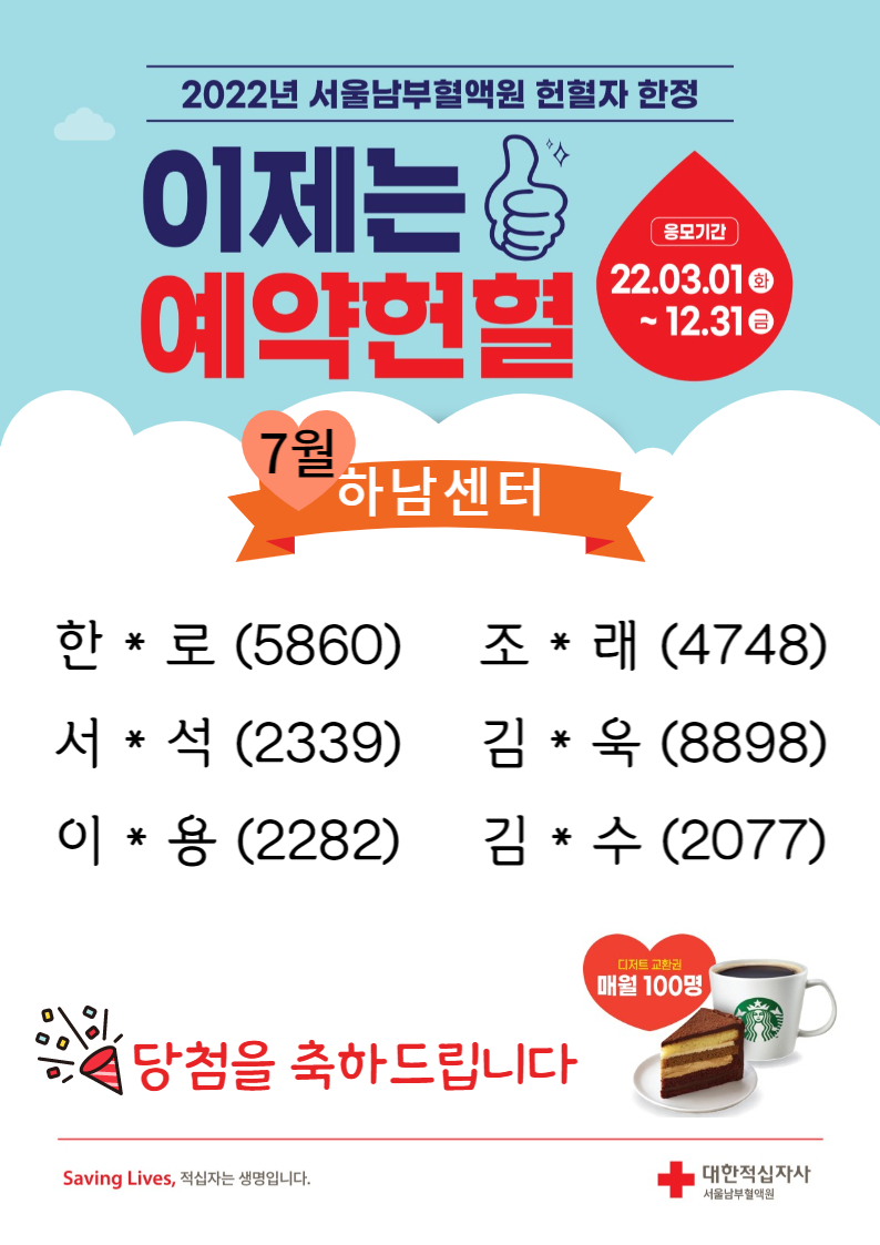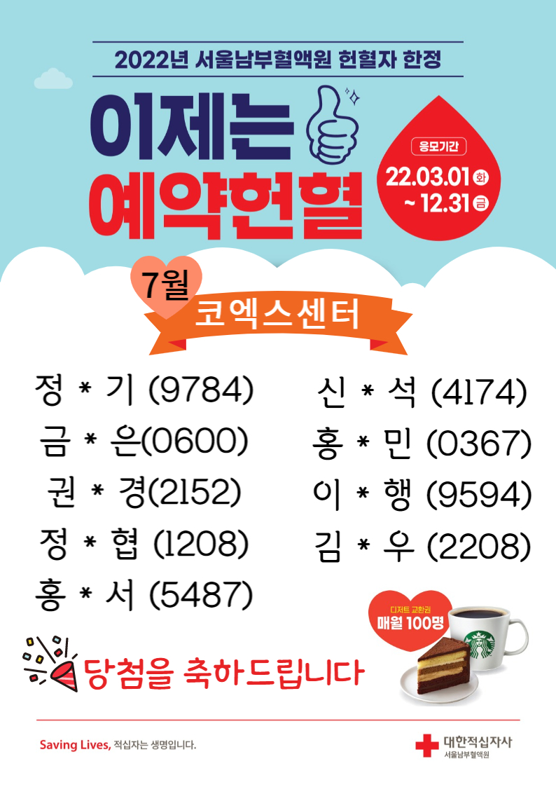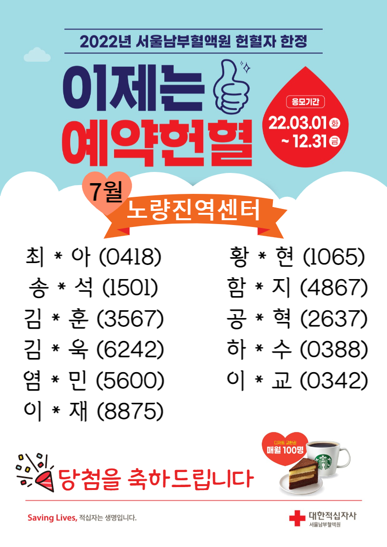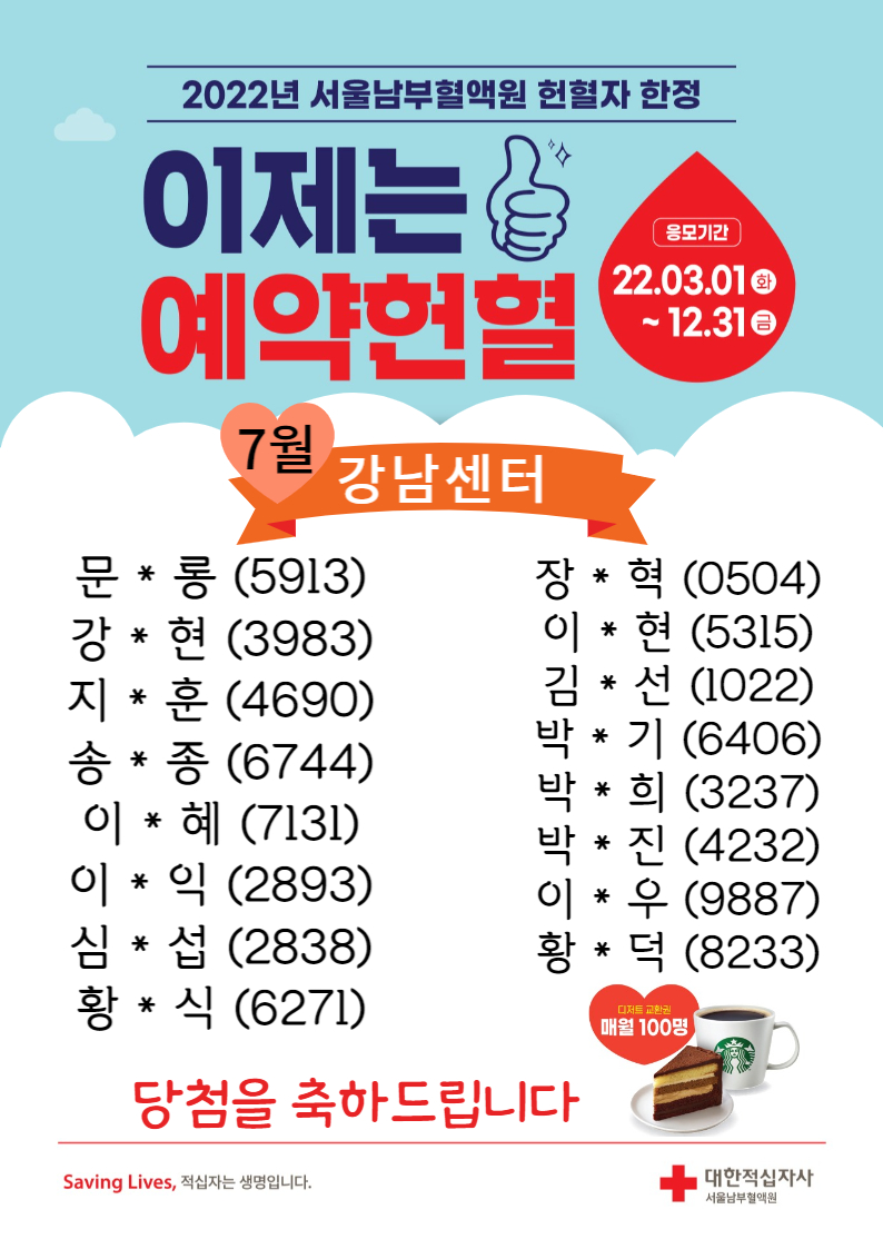 [서울남부] 7월 예약헌혈 이벤트 당첨자 발표
