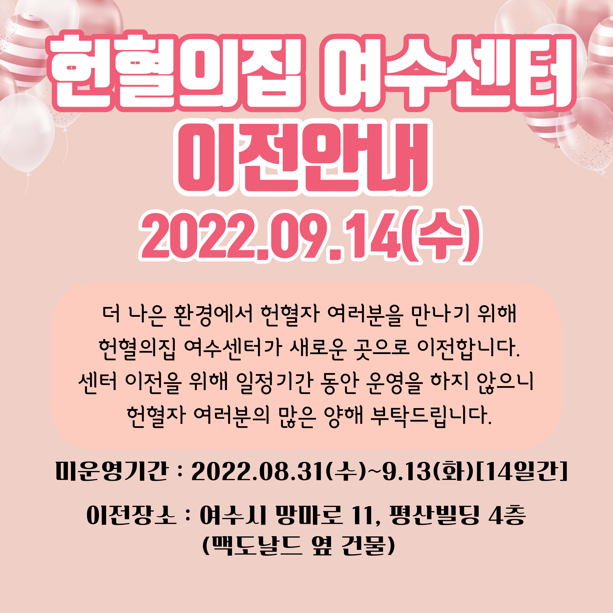 헌혈의집 여수센터 이전으로 인한 한시적 운영 중지 안내