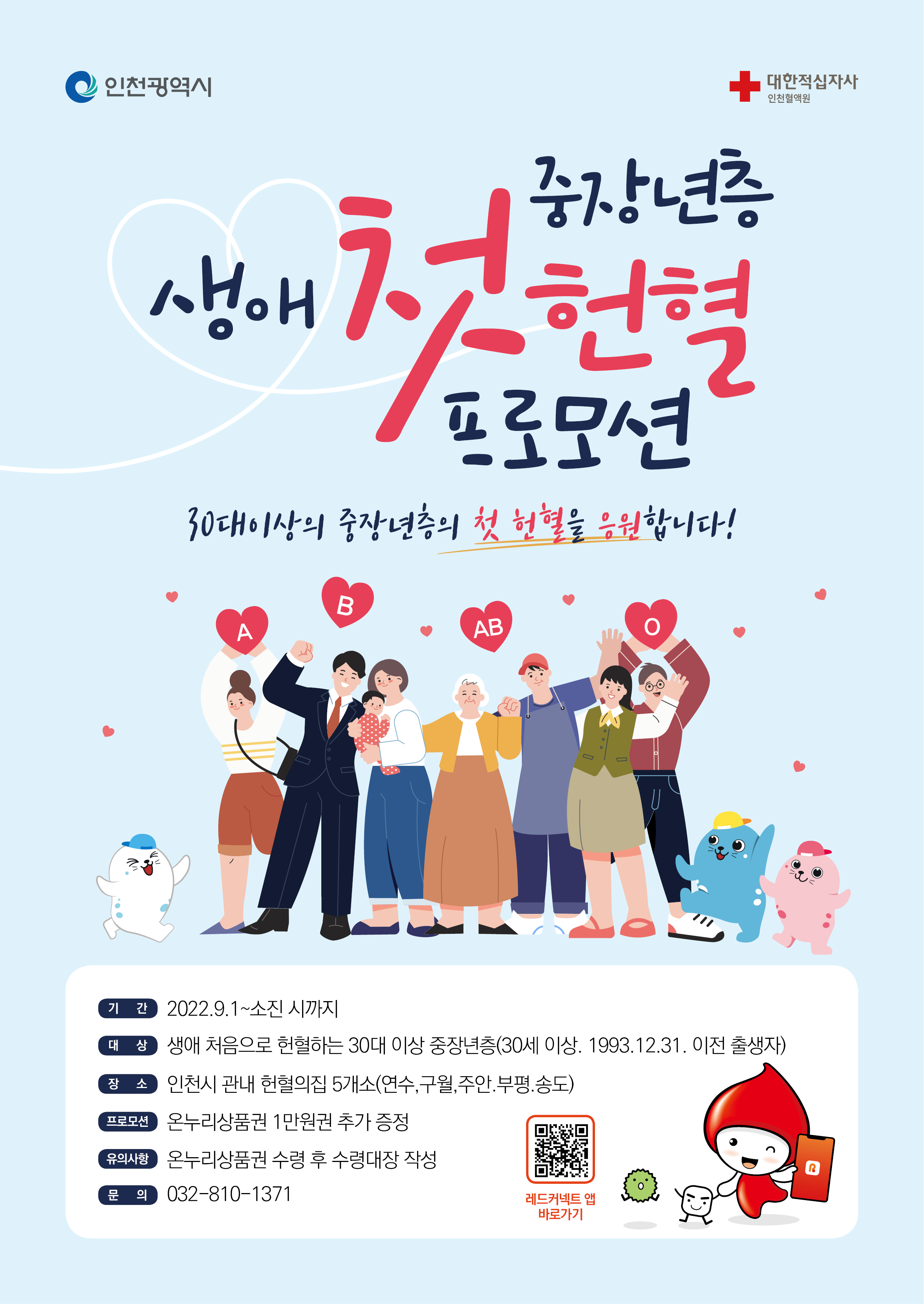 더불어 인천광역시와 함께하는 중장년층 생애 첫헌혈 프로모션을 다음과 같이 안내드리고자 합니다.